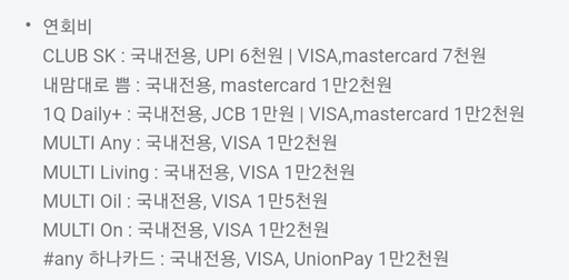 클럽SK카드를 선택한 이유는 간단합니다. 연회비가 저렴하고, 제가 받을 수 있는 혜택이 가장 크기 때문입니다. 대부분 비슷하지 않을까요?