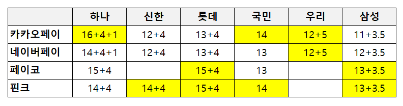 핀크 : 하나카드 14만원, 신한카드 14만원, 롯데카드 15만원, 삼성카드 13만원
