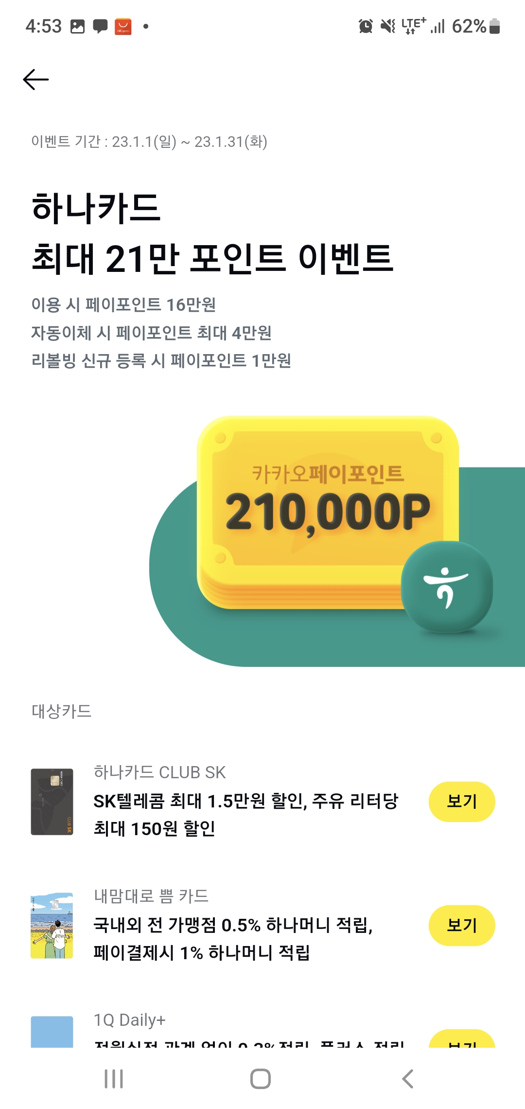 무조건 최대 혜택을 받는다면, 카카오페이에서 하나카드 발급이 유리합니다. 21만원을 주니깐요.