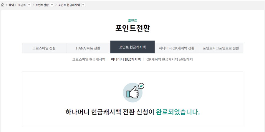 2. 혜택 > 포인트 > 포인트 전환 > 하나머니현금캐시백 선택